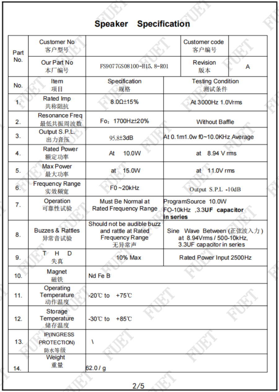| Impedance | 8.0Ω±15% | At 3000Hz 1.0Vrms |